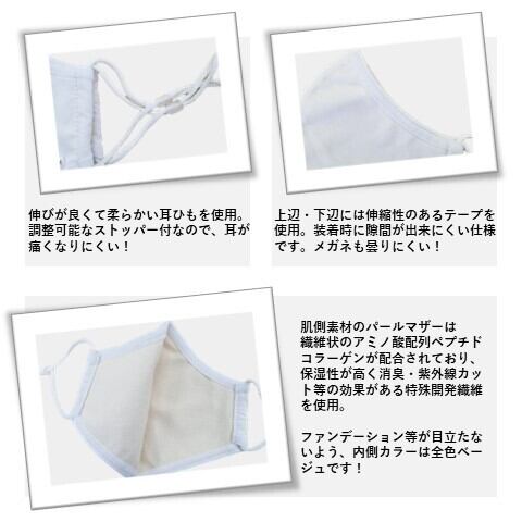 コラーゲン配合の開発繊維“パールマザー”を使用し、お肌にやさしいマスクです。