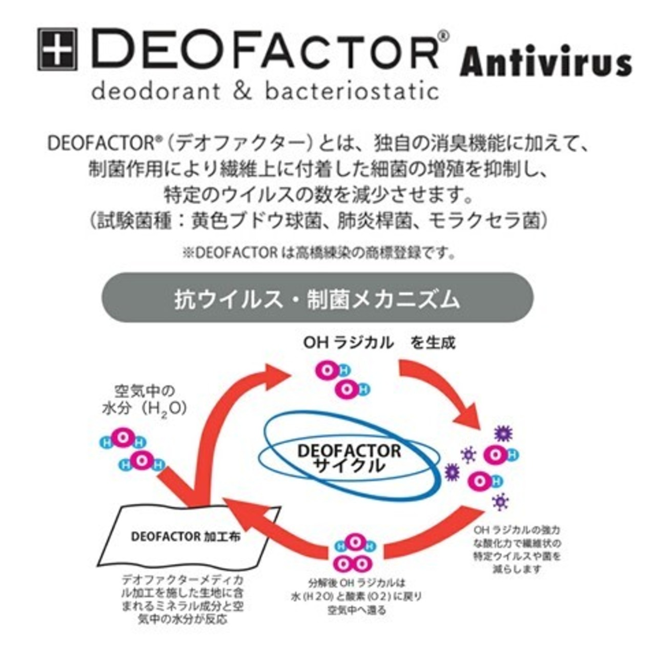外側生地:デオファクター加工を施し、付着した菌やウイルスを減少させる効果があります。【デオファクター・制菌加工 ポリエステル65%、綿35%】