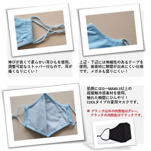 【肌側生地】触れた瞬間にひんやり!Q-MAX0.3以上の超接触冷感生地を使用し、夏用マスクにピッタリ!(ナイロン90%、ポリウレタン10%)
